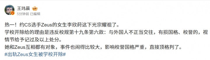 对此媒体王玮晨直接吐槽该女生反向光宗耀祖,她和Zeus互相都有对象,影响校誉国格严重,直接顶格处理!