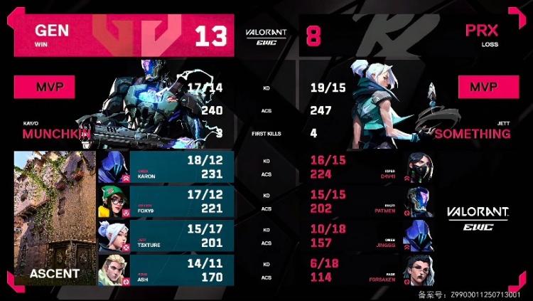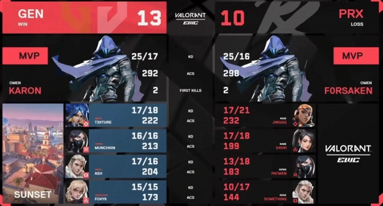 GEN进攻方撕碎PRX的防线,第九回合GEN先杀两人后成功拿下关键一分,后续PRX强起追分但是枪法被GEN全队diff,GEN在上半场拿下8-4的比分,下半场PRX输掉手枪局后强起拿下ECO局,GEN凭借T3稳定火力的四杀打断PRX的得分节奏,随后PRX面对先拿赛点的GEN无力反抗被GEN拿下胜利!