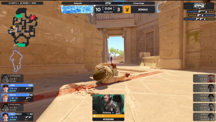 第10局3DMAX四人Eco,Graviti独自掏出吹风机,LVG骚扰A厅,Su3在B给烟,随后LVG集结水下打A大,Ex3rcice看A直接被杀,Emilia进A双杀,LVG光速下包,Graviti与bodyy双人无力回防只能保枪,3DMAX2-8LVG。
