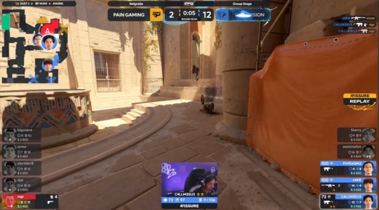 第15局paiN再冲A大,Emilia与西瓜换掉paiN两人,dav1deus进A双杀,nqz在A下包,三叶击杀小雪后被带走,paiN3-13LVG。