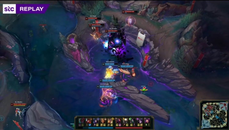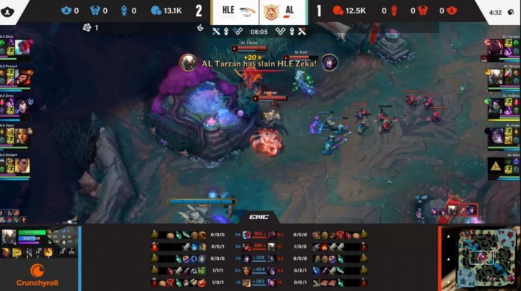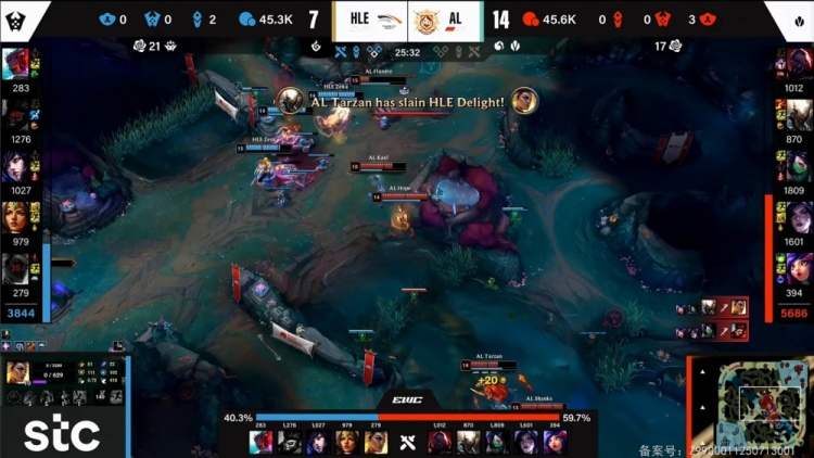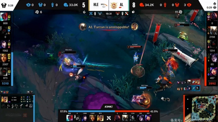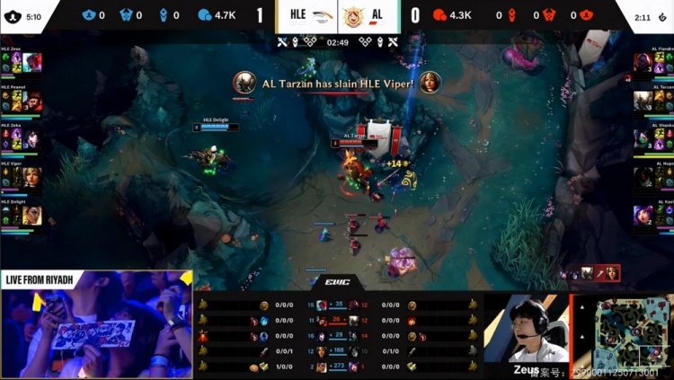中期小龙团,Kael妮蔻正面开HLE三人,Shanks阿卡丽与Tarzan潘森接连进场打出伤害,Hope卡莎收获双杀但被Viper反杀,AL打出2换4稍占优势。后续厄塔汗团战,Viper吃掉Tarzan潘森大人头拿到一千大米,宙斯吃掉厄塔汗。
