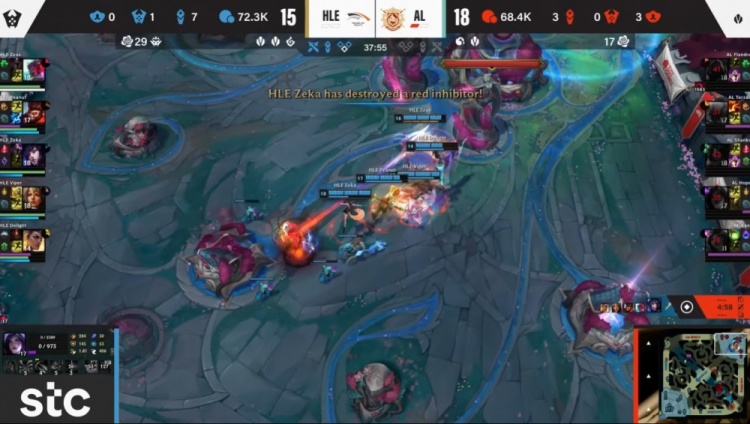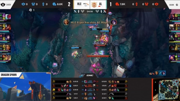 后期小花生抢掉大龙后HLE再吃小龙听牌土龙魂实现经济反超。终极龙魂团,Zeka妖狐进场秒掉Kael妮蔻,Viper希维尔持续输出拿到双杀,HLE打出0换5团灭AL,一波推平AL基地,扳回一城。