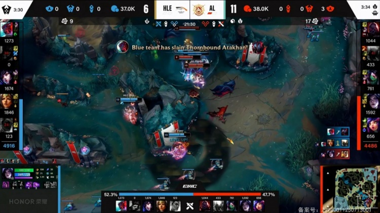 【34:23】HLE下路推进,Kael妮蔻配合Tarzan潘森开团,Shanks阿卡丽融化小花生后再杀宙斯永恩,Flandre赛恩砍掉Delight芮尔,AL打出2换4,经济落后1k。