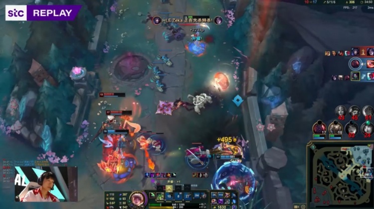 【22:31】Zeka狐狸中路与队友推掉AL一塔,Zeka亲到Kael送小花生人头,双方经济持平。