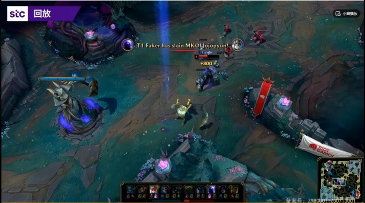 【11:23】河道遭遇,Faker瑞兹开大支援形成四打二!T1先手0换2但是Supa金克丝依靠Alvaro满状态牛头粘住了T1三人,Supa金克丝拿下击杀,激发罪恶快感开跑再切死Faker瑞兹拿下双杀!