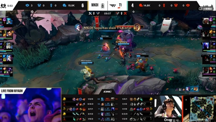 【8:52】双方同步越塔,Oner巨魔越塔配合Doran安蓓萨失误自己白给,上路KOI四越二则是直接强杀掉了T1下路组!这波相当于KOI打了个0换3!