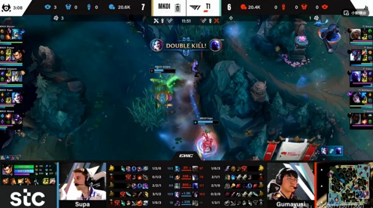 【3:51】下路对线Supa金克丝找到机会,夹子配合牛头二连让Gumayusi卡莎交了个死亡闪!Supa金克丝还跑起来规避了Oner巨魔的追击!不过随后Supa金克丝也贪了,结果被交出海闪的Keria芮尔强行一换一了!KOI的1换2!