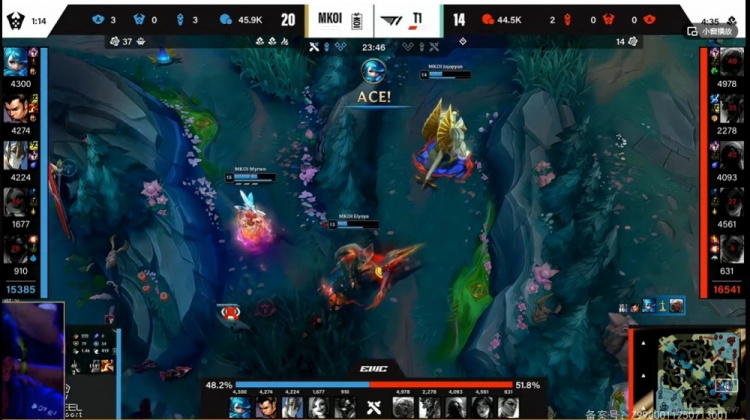 【23:20】小龙团,Elyoya赵信再次抢到了小龙!Supa金克丝被开交双招拉开打残了Gumayusi卡莎!虽然Gumayusi卡莎开飞击杀掉了金克丝自己也活不了啊!残局Myrwn格温拉满输出,配合中野三人一共打出超过12000的伤害!这波KOI打出2换5团灭T1!