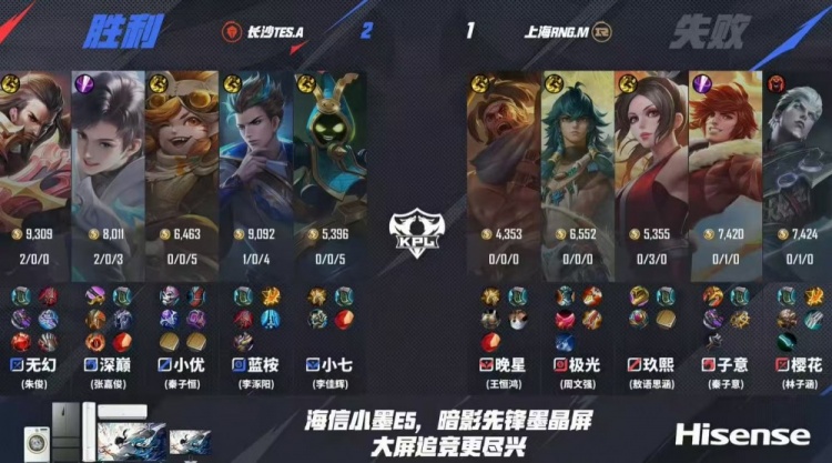 6分钟RNG击杀杨戬,7分钟RNG再次收下杨戬,15分钟TES强开被RNG接住,RNG击杀TES两人,21分钟姬小满绕后进场配合队友团灭TES扳平比分!
