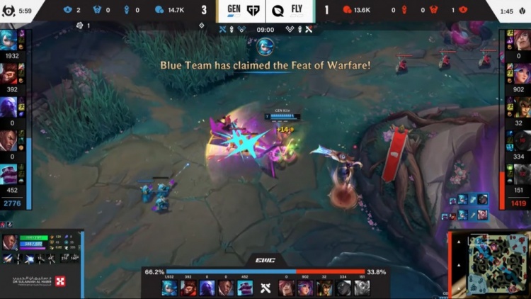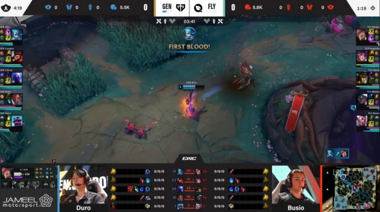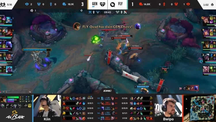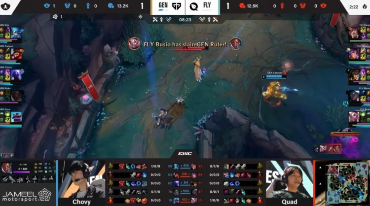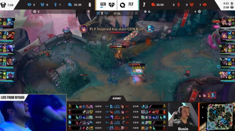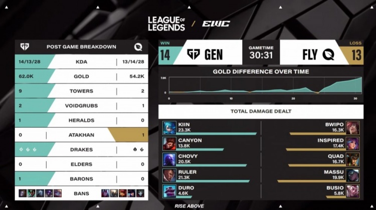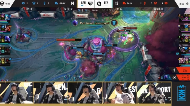 后期小龙团,Canyon抢龙成功,Bwipo腕豪抱摔ruler但没能将其击杀,ruler卢锡安反手双杀,随后GEN打出0换3并吃下大龙,经济领先6k。最终中路团战GEN轻松打出2换4后推平FLY基地,赢得比赛胜利。