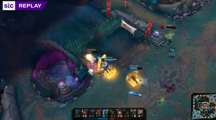 【12:12】Duro布隆河道被FLY四人逮捕,Canyon猴子没闪被FLY四人追击,人头送给Bwipo腕豪,FLY打出0换2。