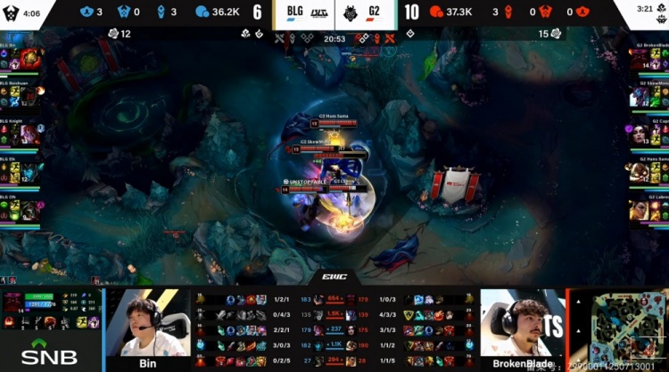 中期BB奥恩配合队友多次击杀阿Bin,G2推掉BLG上路一塔并击杀beichuan,随后BLG中路释放先锋换掉两座外塔追回经济。后续G2下路推进再度发力,融化beichuan后掌控厄塔汗。