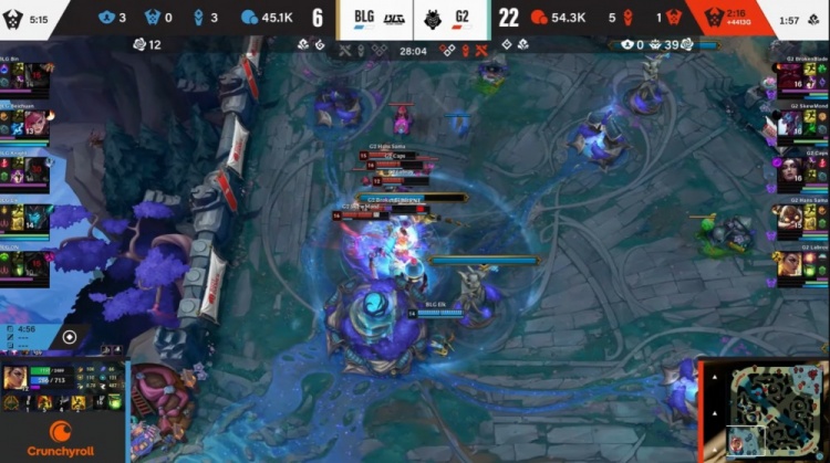 后期中路团战Hans Sama飞机轰出三杀,G2轻松0换4,BLG大势已去,随即Caps击杀knight后再与队友团灭BLG,G2吃掉大龙一波推平BLG基地,完成让一追二晋级四强,BLG惨遭淘汰。