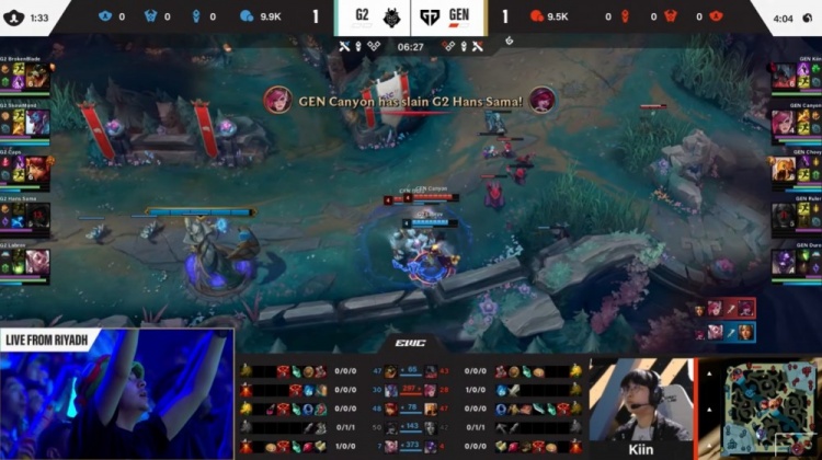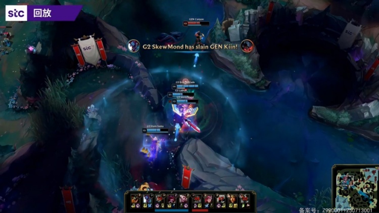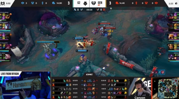 【9:08】GEN三人中路抓掉Caps后,Canyon被赶来的Hans Sama补掉,双方打出1换1。