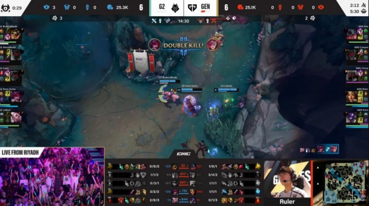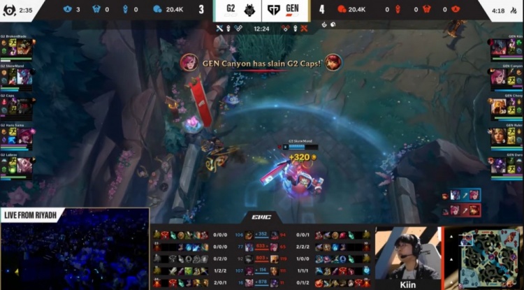 第二局前期Canyon蔚灵动游走,配合Ruler希维尔与Duro牛头击杀Hans Sama霞与Labrov洛,GEN率先打出优势。Caps安妮持续被抓,双方你来我往人头交替上升。