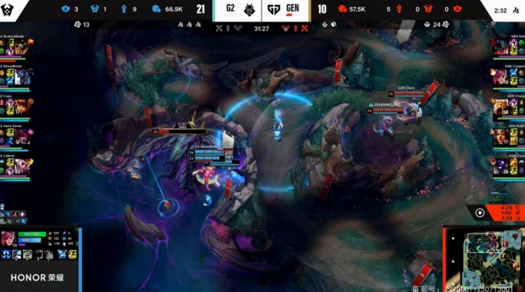 【22:14】上路团战,Chovy沙皇送BB嘴里,Canyon送BB双杀,Hans Sama霞起飞双杀,G2打出0换4,经济反超2k。