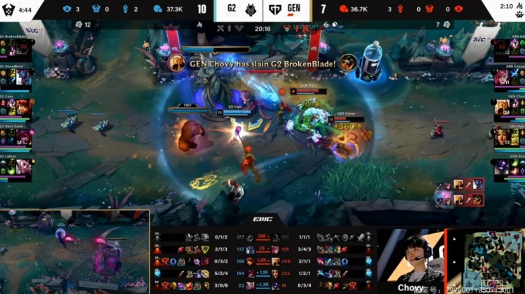 【19:34】GEN下路推进,G2中上野三人瞬间被融化,Chovy沙皇推两人拿到双杀,GEN打出1换3,经济领先1k。