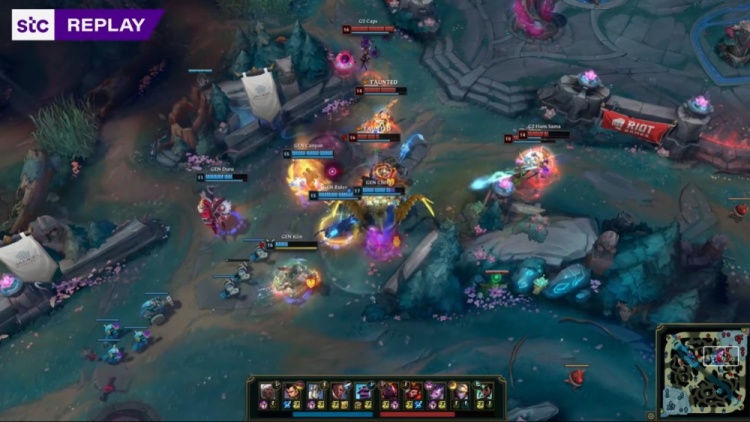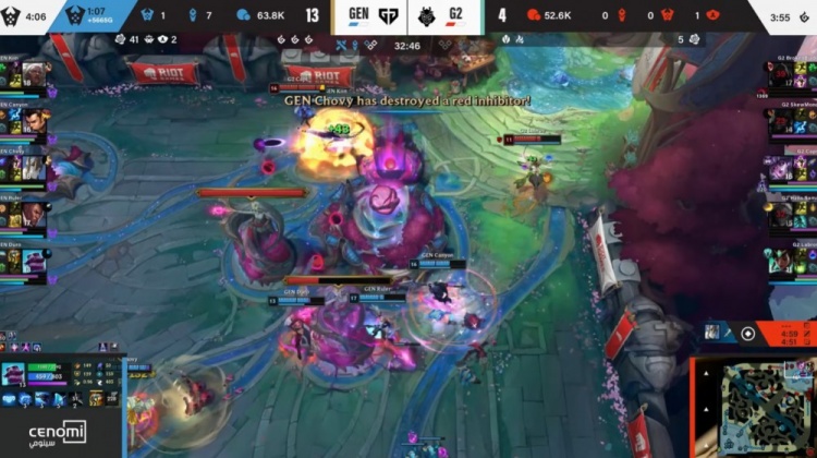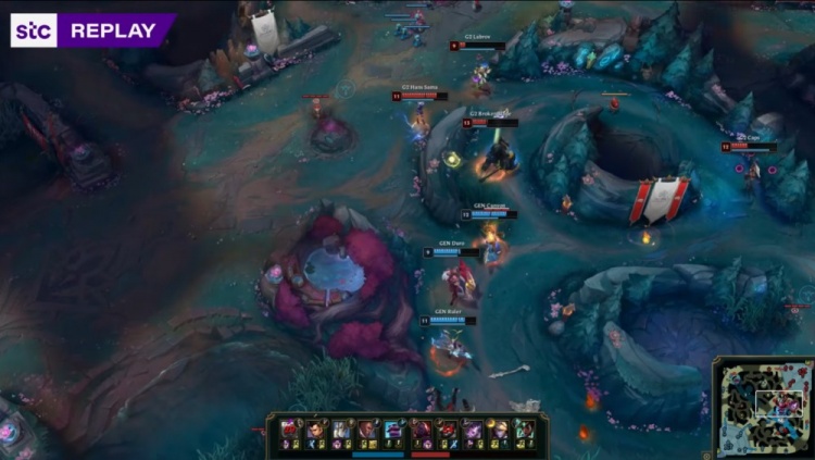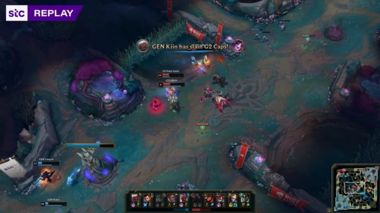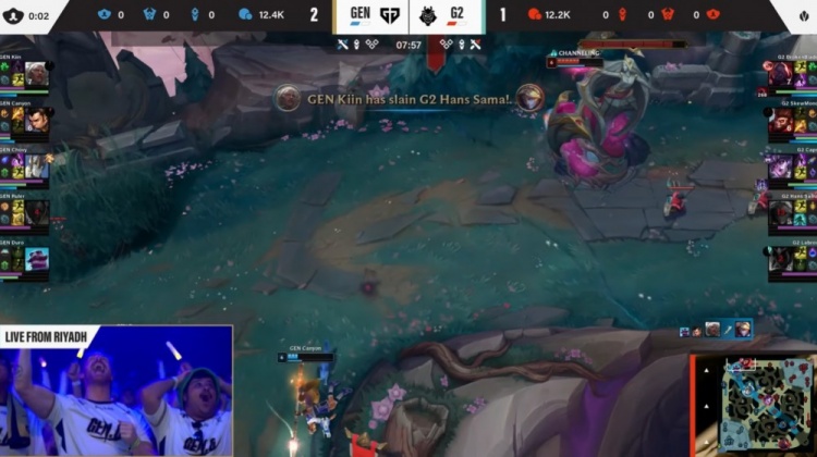 【11:59】GEN三人中路抓掉Caps辛德拉,SkewMond猴子被开,G2三人来救,上路三角草,Chovy加里奥拉扯再杀Labrov,Kiin安蓓萨补掉残血BB赛恩,GEN打出0换3。经济领先3k。