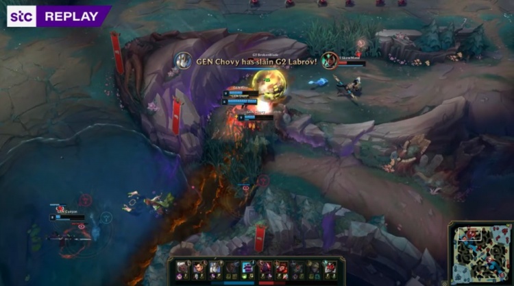 第三局前期GEN多次围绕上半区展开攻势,Ruler卢锡安在上路击杀Labrov卡尔玛后被换掉,Kiin安蓓萨锁头Hans Sama伊泽瑞尔完成击杀。随后GEN上路三角草拉扯G2,Chovy加里奥和Kiin安蓓萨击杀Labrov与BrokenBlade赛恩,打出0换3建立经济领先。