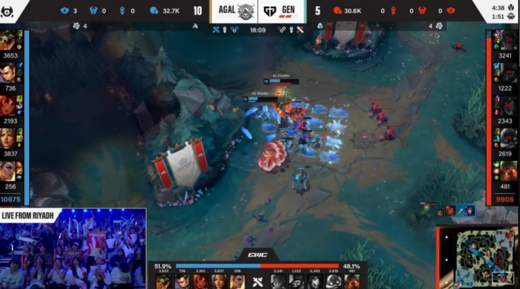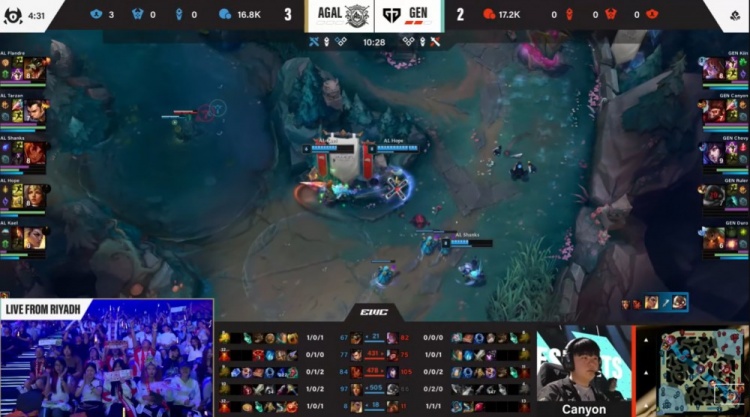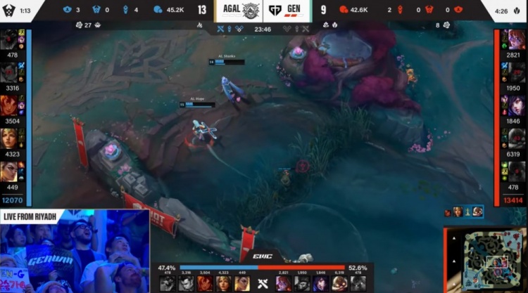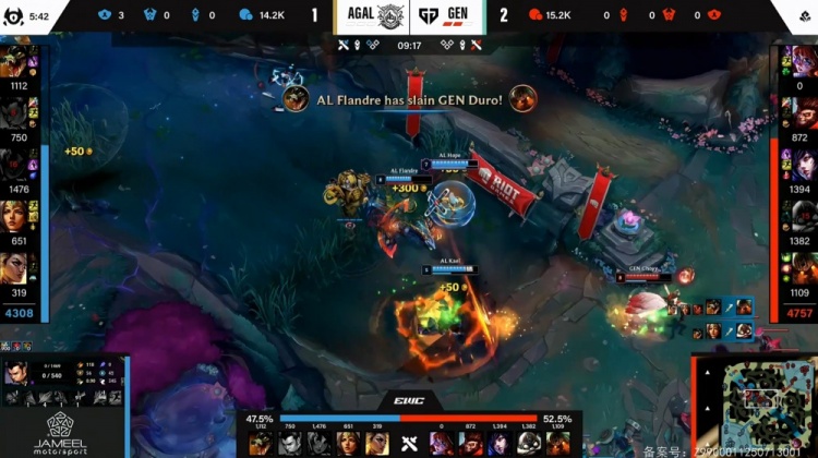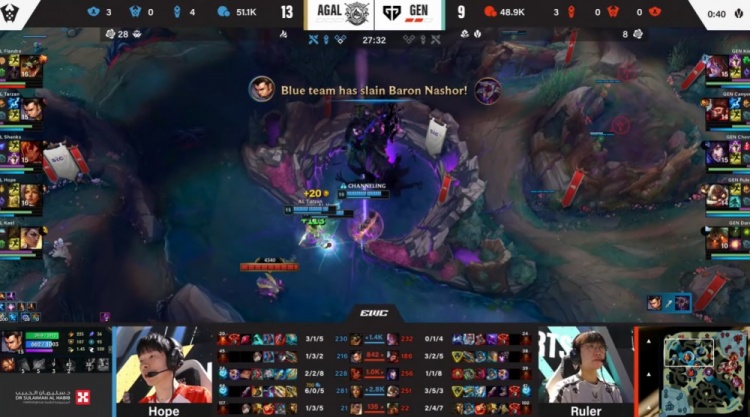 中期Kiin阿萝拉主动开团,双方辅助互换。Shanks岩雀大招追击Ruler得手,双方再次2换2。小龙团中Canyon猴子先击杀Kael芮尔,Flandre鳄鱼与Hope希维尔连斩Ruler与Kiin,Chovy狐狸孤立被杀,AL团灭GEN拿到经济领先。