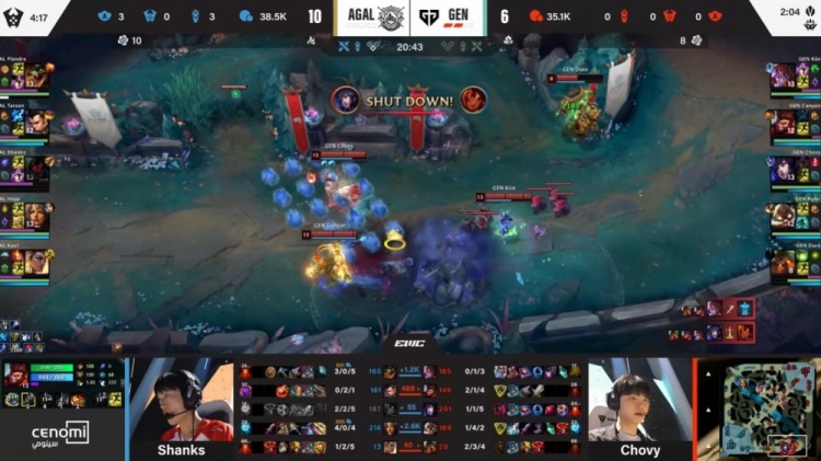 【20:38】Shanks下路吃兵被GEN三人越塔击杀,Tarzan韩信吃掉厄塔汗,AL经济领先2k。