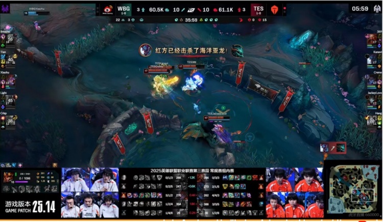【35:43】第六条小龙刷新,下路TES抱团先手开Tian皇子将打出复活甲,但是Xiaohu阿萝拉罩大进场也换掉了Hang曙光!随后WBG上野强杀JKL烬被他交双招拉扯成功!正面Creme塞拉斯进场收割!TES打出1换4,拿下水龙魂+大龙!