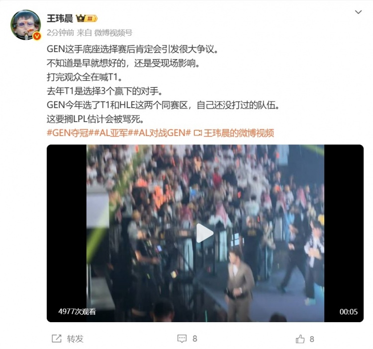 2025EWC英雄联盟项目决赛,GEN拒绝让二追三击败AGAL夺冠,赛后GEN选择AGAL、T1、HLE为底座,媒体人王玮晨锐评GEN把T1挡底座:争议很大搁LPL估计会被骂死。