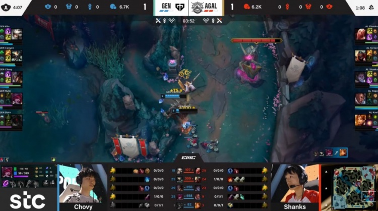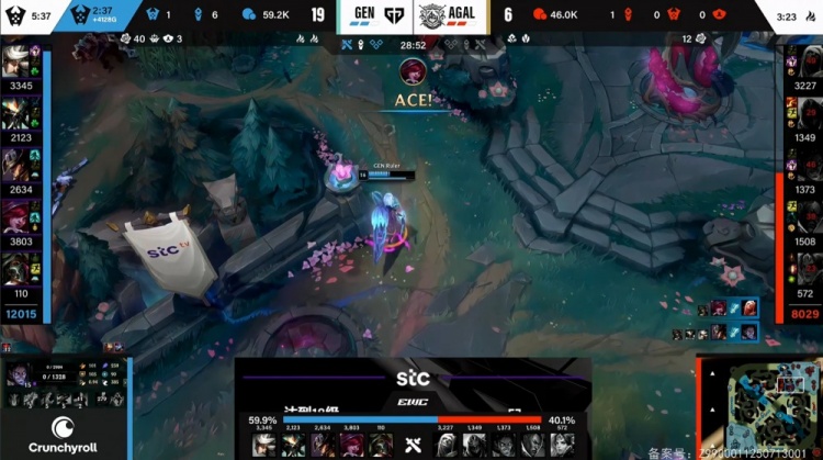 决胜局前期下路3V3,Ruler霞射杀AL双人组,Tarzan拿到Duro人头。小龙团Chovy卡牌秒切黄牌定住Shanks将其融化,GEN经济领先3k。