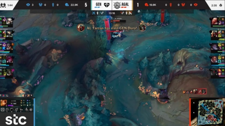 【15:27】AL三人下路逮捕Kiin,Tarzan再拿一个人头,战绩来到3-0-0。GEN推掉AL中路一塔, 经济领先2k。AL连吃两条小龙,本局为风龙魂。