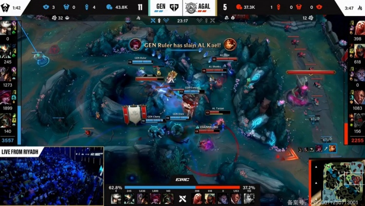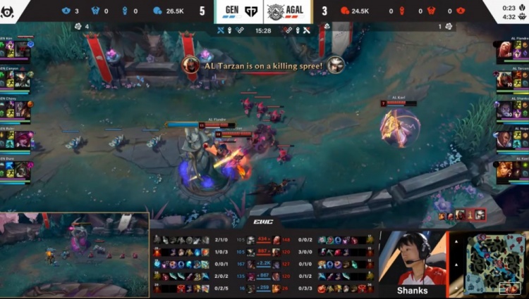 【23:13】GEN入侵AL野区,ruler霞先杀Kael,Canyon蝎子拉人但被Flandre吸血鬼融化,ruler霞再杀Shanks,GEN打出1换2,经济领先7k。
