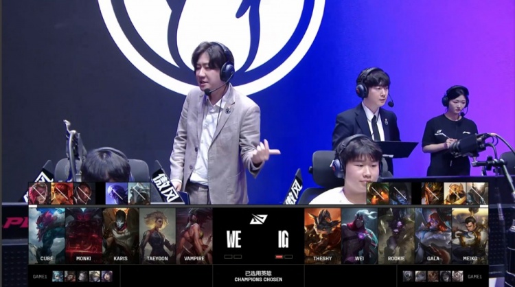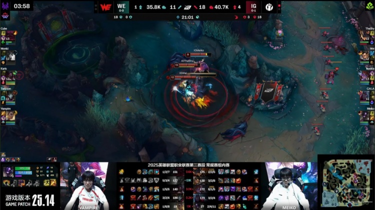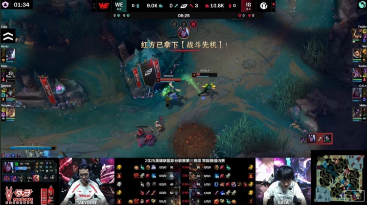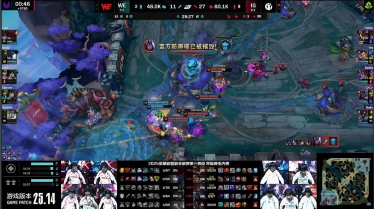中期iG持续扩大优势,TheShy兰博与Rookie在下路配合击杀WE双C,GALA韦鲁斯在团战中稳定输出,iG先后拆除多座防御塔并吃下厄塔汗,经济领先拉开至5k以上。