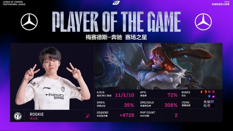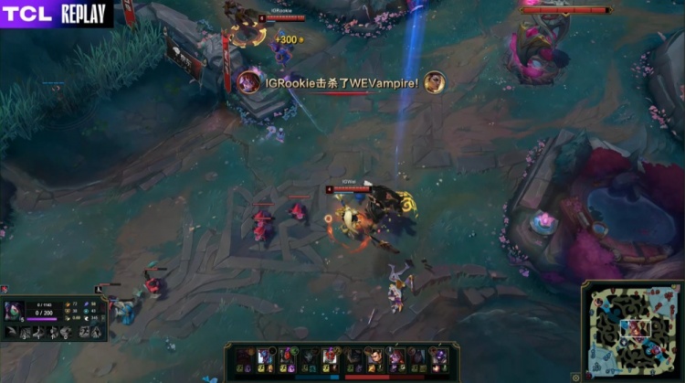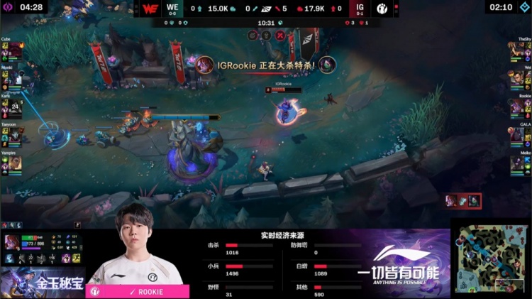 【10:32】Karis阿卡丽下路吃线被Rookie阿萝拉开大进塔单杀,上路Monki巨魔配合Cube抓掉TheShy,Wei来下路gank,Meiko换掉Vampire,iG经济领先3k。