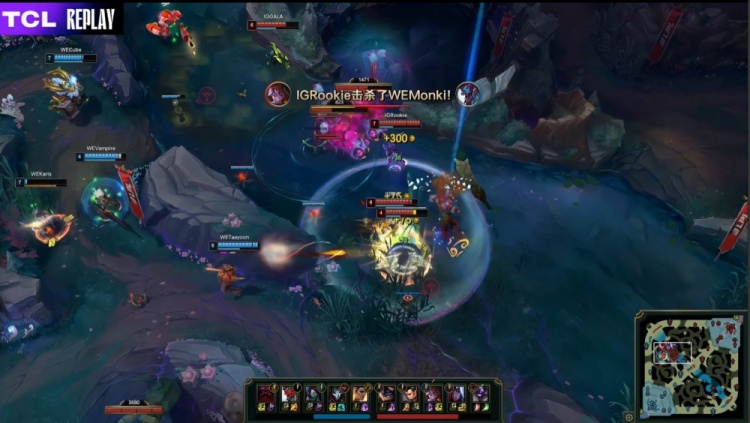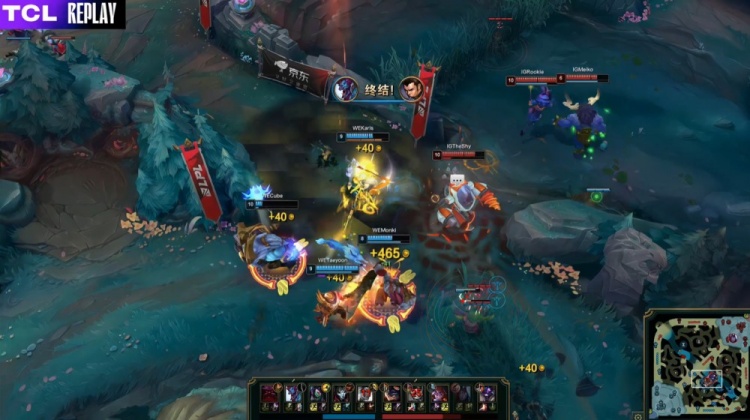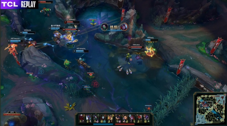 【19:55】野区团战,Wei先杀Vampire,Taeyoon烬点掉GALA,TheShy与Rookie联手击杀WE双C,Monki巨魔绕道下路被TheShy逮捕,iG打出1换3吃掉厄塔汗,经济领先5k。