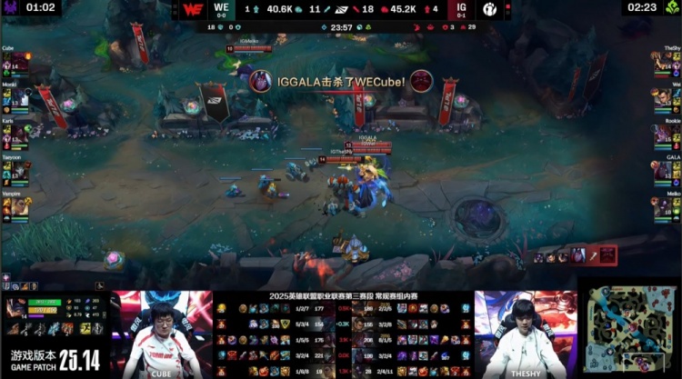 【23:55】Cube奥恩下路带线被iG四人融化,GALA吃掉人头,随后iG三人推掉WE中路高地塔后转下再推WE二塔,TheShy上路二塔开大清兵,iG经济领先6k。