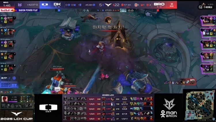 【25分钟】野区交战Hype卢锡安拖够了足够时间打出了足量的输出!DK为了击杀卢锡安代价太大了,被BRO击杀四人,BRO拆掉中路高地,回头拿下大龙!9K的经济差了!