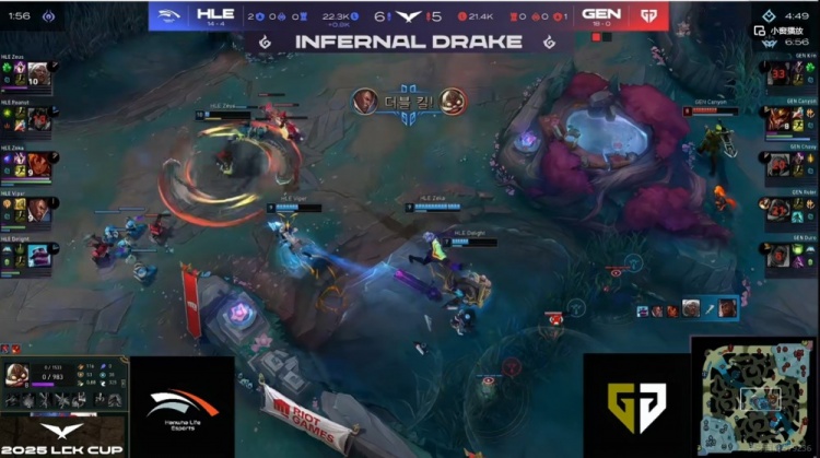 【24:04】小龙团,Canyon皇子抢到了小龙!奎桑提顶在前面毫无压力,Zeka岩雀先倒了!Chovy沙皇找到机会直接推回了没闪的Viper卢锡安将他秒掉了!HLE没输出了啊!GEN打出0换5团灭HLE,直接拿下荆棘厄塔汗!