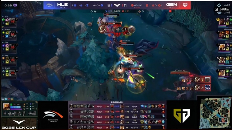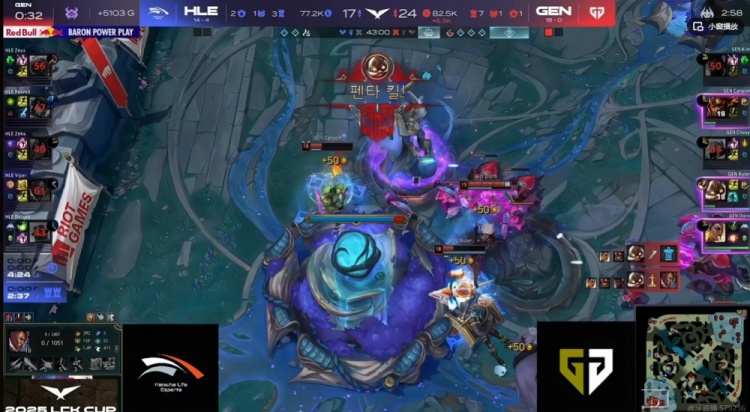 【4:44】HLE三人入侵野区但是GEN根本不怕啊,Ruler库奇赶到GEN反打,打出了Peanut猪妹闪现之后追击将他强杀,Duro芮尔控制拉满,这波Ruler库奇双杀,Chovy沙皇也换到了击杀!GEN的1换3!