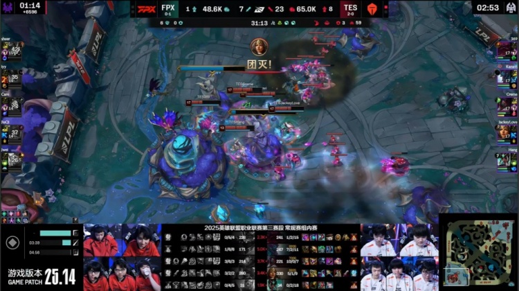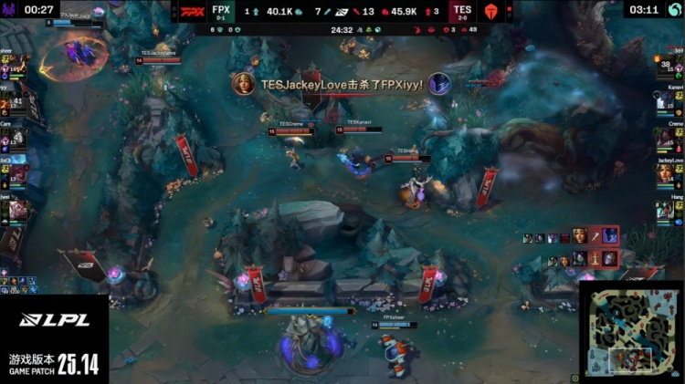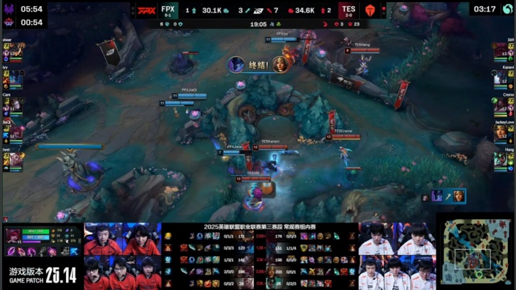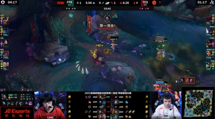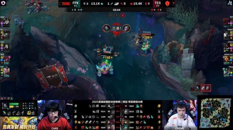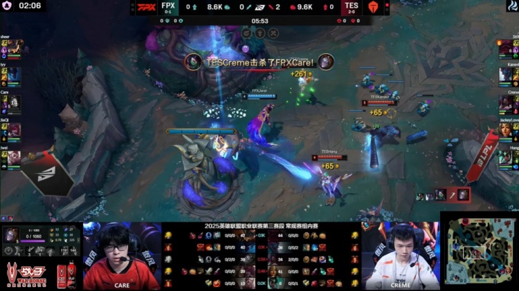 中期iyy梦魇尝试多次开团,配合JiaQi霞与Care发条打出击杀,但Creme阿卡丽与Kanavi巨魔持续带动局势,TES逐步扩大领先,并推掉FPX下路外塔。