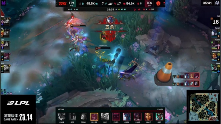 【28:01】龙魂团,Kanavi吃掉水龙魂后狂咬五杀,TES打出1换5团灭FPX后吃掉大龙,经济领先1w2k。