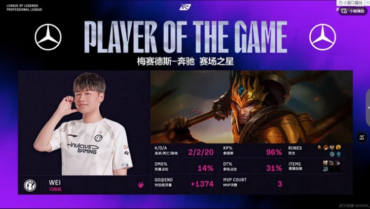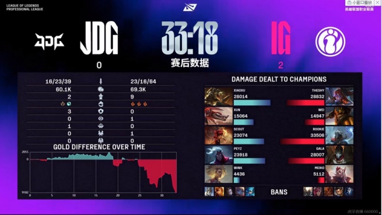 【32:10】上路团战JDG想开,结果被Wei皇子绕后击杀掉了Wink芮尔,Wei皇子冲上高地盖大强杀Scout安妮!随后没人管的GALA烬输出拉满三杀收尾,iG团灭JDG结束比赛!延续自己对JDG今年一整年到现在的不败战绩!