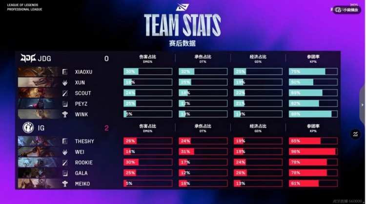 第二局Xiaoxu鳄鱼短打长抗住了TheShy阿萝拉的对线,JDG借助阵容优势先拿两条小龙+下路越塔0换2之后拿到优势!但是中期先是小龙团Wink芮尔白给,JDG想追击结果Peyz维鲁斯落单被反开,iG一波团战打回劣势!不过Wink芮尔随机河道团吸四个立功帮助JDG拿下厄塔汗!但是Scout安妮又在下一条小龙团落单白给,iG打出1换4!没闪的Peyz维鲁斯马上又在中路白给,iG这次团灭JDG拿下大龙!最终高地团Wei皇子绕后+冲锋盖大配合队友打出0换2,GALA烬三杀收尾!iG横扫JDG,延续2025年至今对JDG的大场不败!