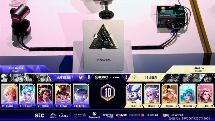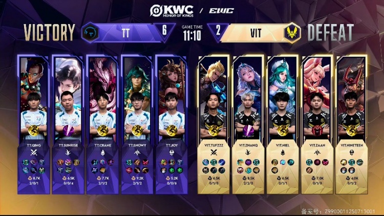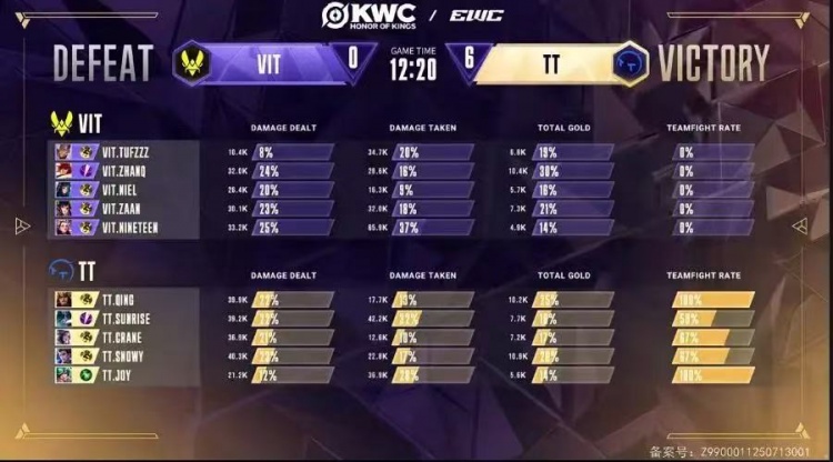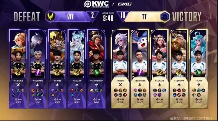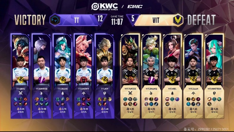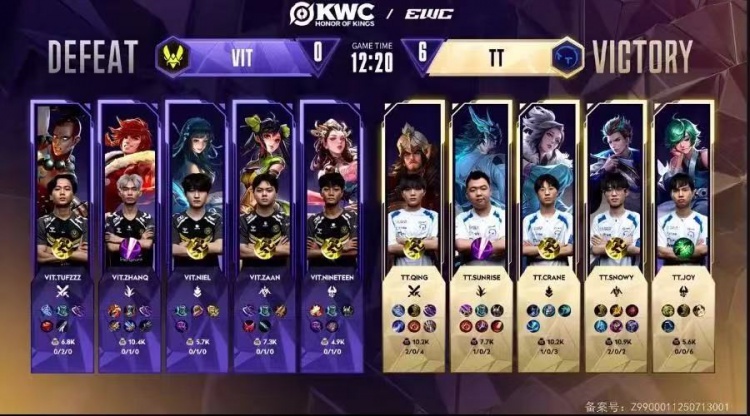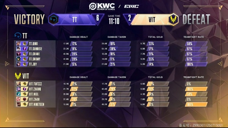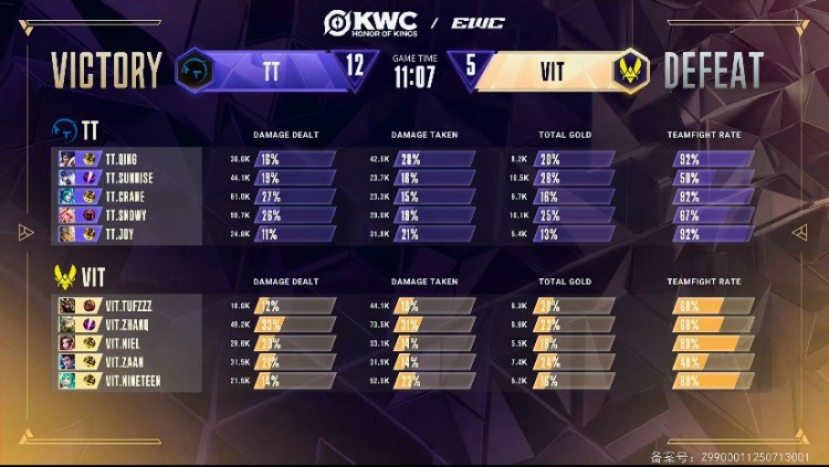 3分50VIT下路收下朵莉亚一血,6分20TT中路推进VIT强开但是被TT反打击杀两人,7分40TT下路利用后羿大招强开,TTG打出1换3团战,9分钟TT中路带着兵线推进TT击杀两人后直接一波带着兵线拿下胜利!