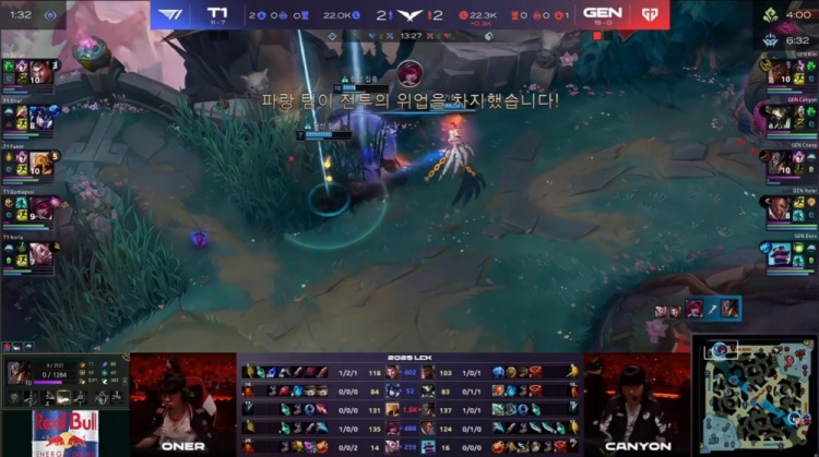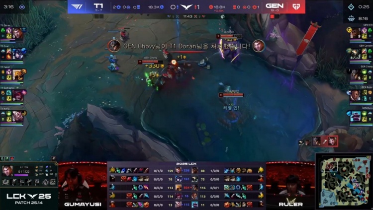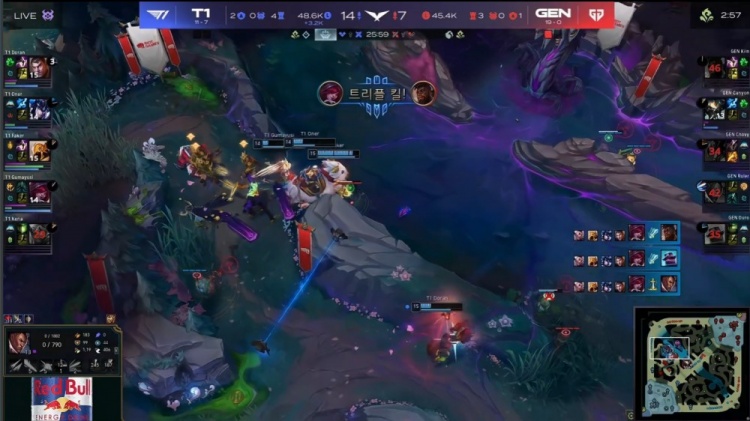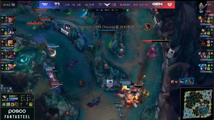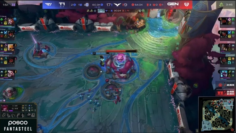 【12:58】GEN三人追上,Canyon蝎子过墙越塔钳空被杀,小吕布霞随后来上吃掉Ruler卢锡安人头,Chovy卡牌上路吃线又被T1三人越塔带走,T1打出0换3。