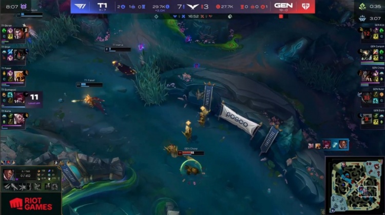 中期Faker沙皇与Oner猪妹配合,连续在小龙团与野区团中击破GEN正面,经济逐步反超。