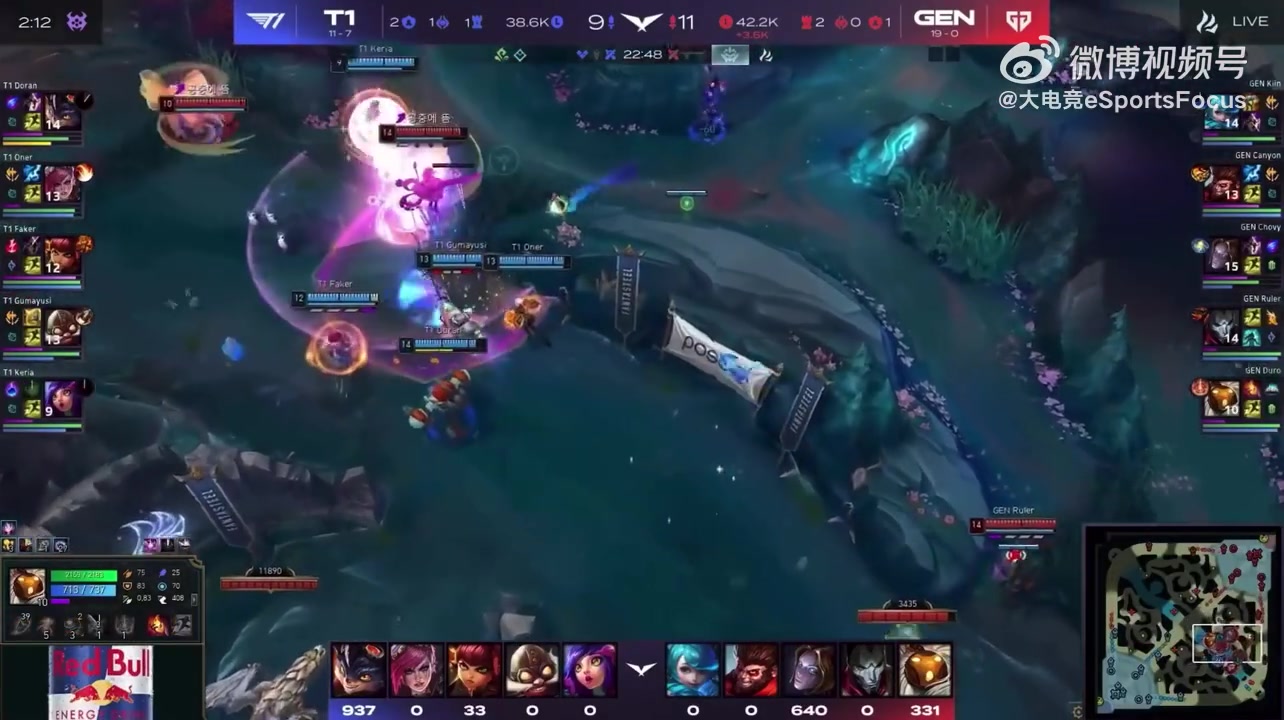 LCK第三赛段GEN 1-0 T1,Chovy创造历史级名场面:发条大五个河道团0换5团灭T1。