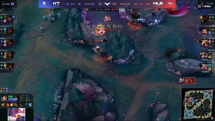 【20:41】厄塔汗团Zeus奎桑提顶在前面吃满伤害,帮助队伍拿下厄塔汗!残局Bdd还想打,但是有大的赵信+洛牵扯了太多注意力,正面的HLE双C没人管爽输出!Zeka沙皇肉身进场推了还丝血锁住!最终Delight洛追死了Bdd岩雀,这波HLE打出1换5团灭KT!8K经济差了!