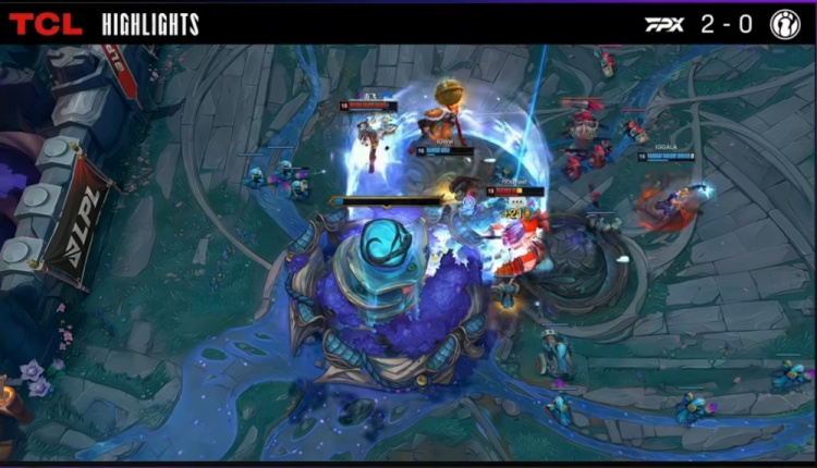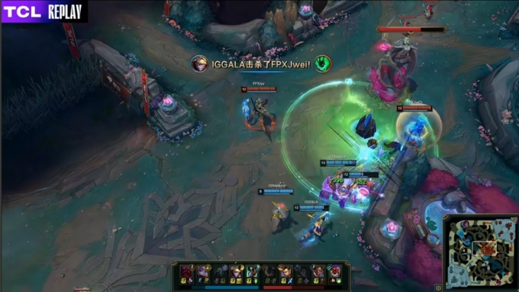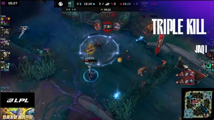 第二局前期Jwei锤石钩中GALA伊泽瑞尔,配合JiaQi卢锡安完成击杀,巢虫团中Care塞拉斯配合JiaQi击杀GALA,随后JiaQi卢锡安收下三杀,FPX建立经济领先。