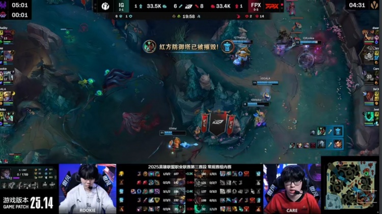 【22:28】iG四人中路逮捕Jwei,Wei波比锤飞iyy,上路Rookie推掉FPX一塔,双方经济持平。