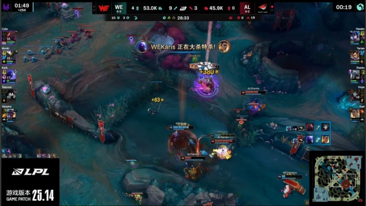【28:24】河道团战,Tarzan赵信捅飞Taeyoon女警,但正面Cube赛恩融化王杰,Flandre小猪吃到Karis瑞兹人头,Tarzan孤立无援被WE三人集火带走,WE打出1换3,经济领先8k。