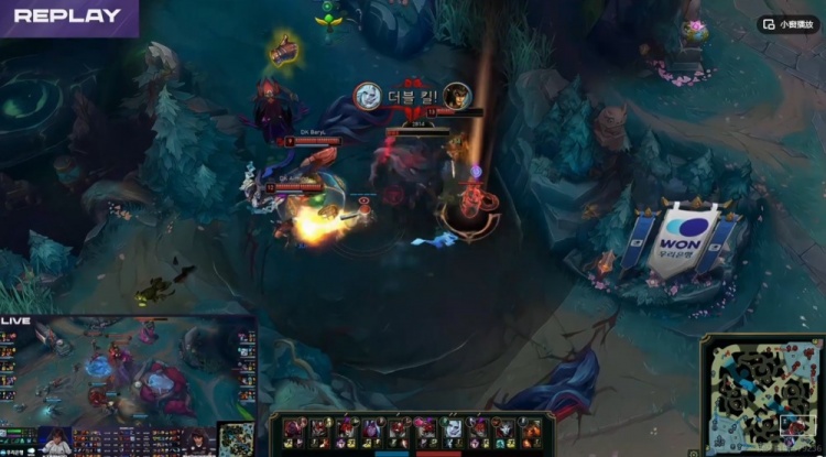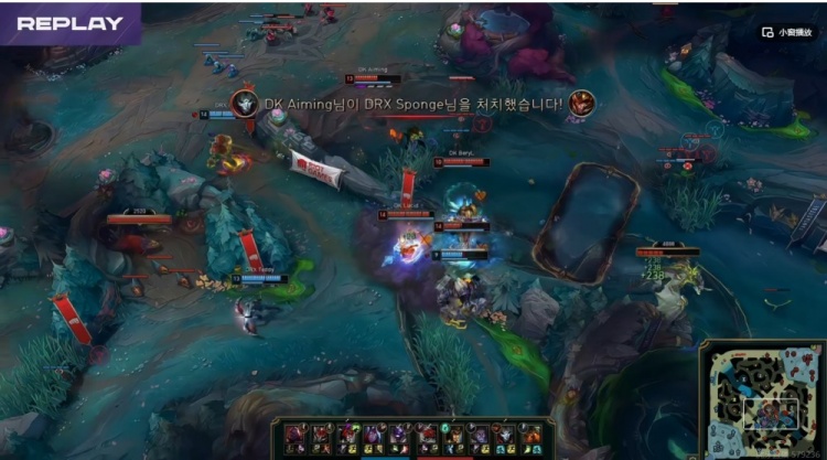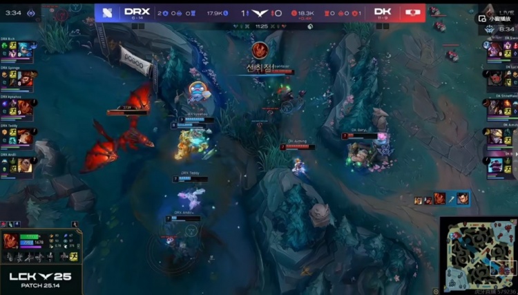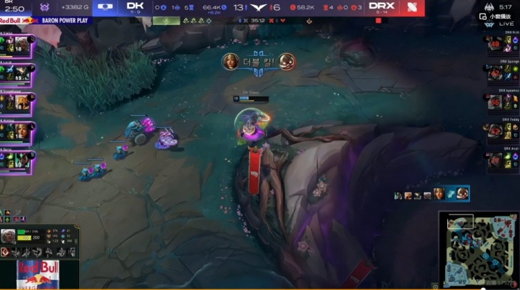 【22分钟】河道DRX逮捕BeryL泰坦之后开打厄塔汗,双方团战,SMK塞拉斯偷到牛头大,冲锋进场一打三拖够了时间!反而是Sponge皇子先倒下!虽然牛头+塞恩都Q了三个但是Lucid佛耶戈再次捡魂了!这波DK打出2换3,拿下厄塔汗!
